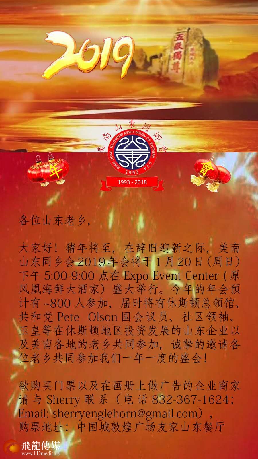 猪年将至,在辞旧迎新之际,美南山东同乡会2019年会将于1月20日(本周日)下午5:00-9:00点在Expo Event Center (原凤凰海鲜大酒家)(15156 Bellaire Blvd,Houston TX 77083)盛大举行。今年的年会预计有~800人参加,届时将有休斯顿总领馆李强民大使等领导、共和党Pete Olson国会议员、社区领袖、玉皇集团、天时集团等众多在休斯顿地区投资发展的山东企业以及美南各地的老乡参加,山东同乡会诚挚的邀请各位山东老乡以及社区朋友共同参加同乡会一年一度的盛会!