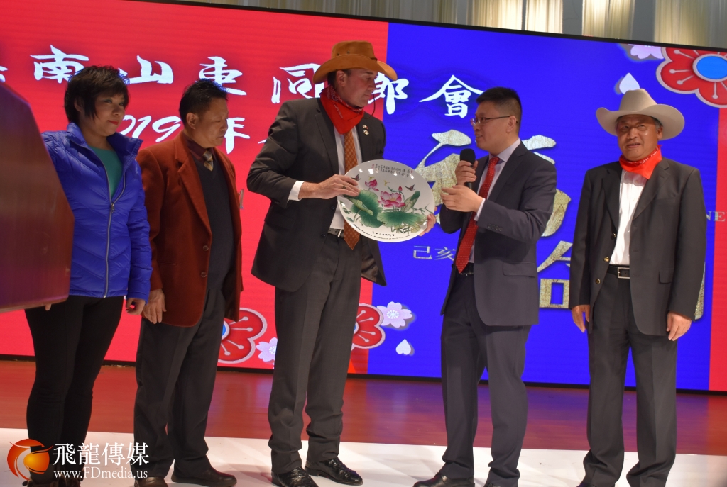 美南山东同乡会赠送美国国会议员Pete Olson一个具有中国特色的磁盘作为新年礼物。