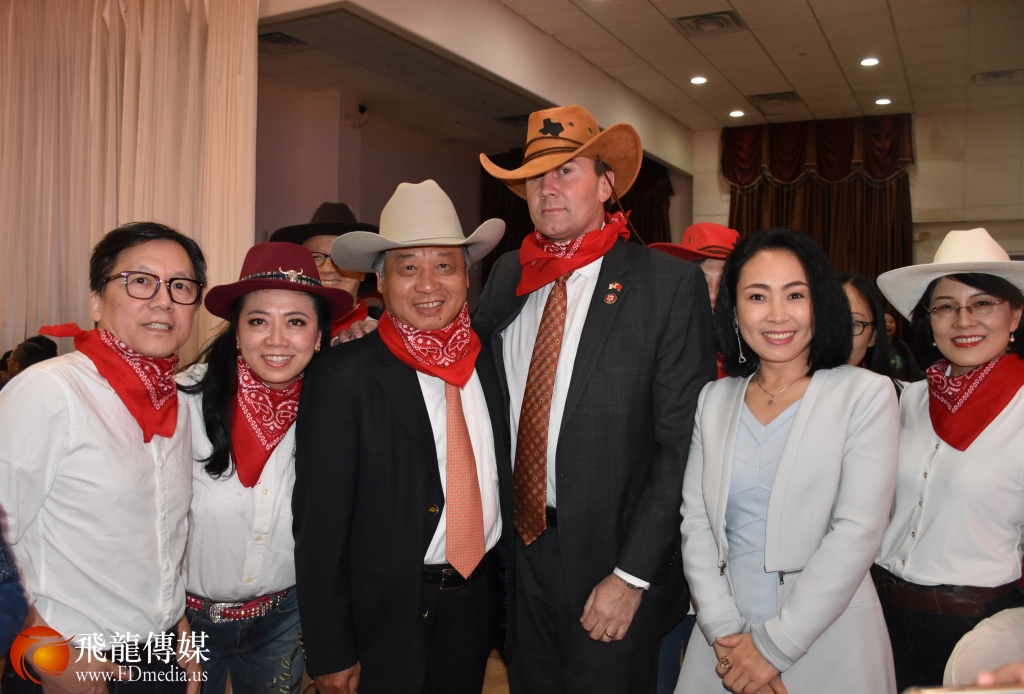 李强民总领事与国会议员Pete Olson戴上体现德州风格的牛仔帽与李玉静医生(右二)、王秀玲(左二)等人合影。