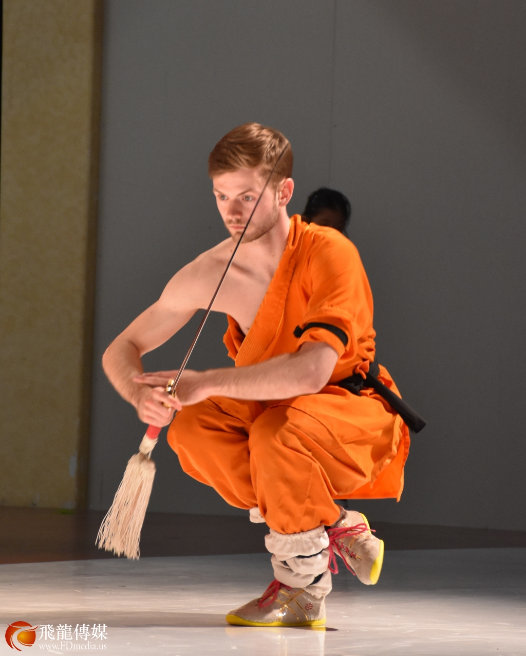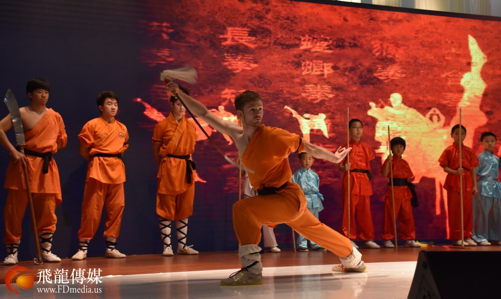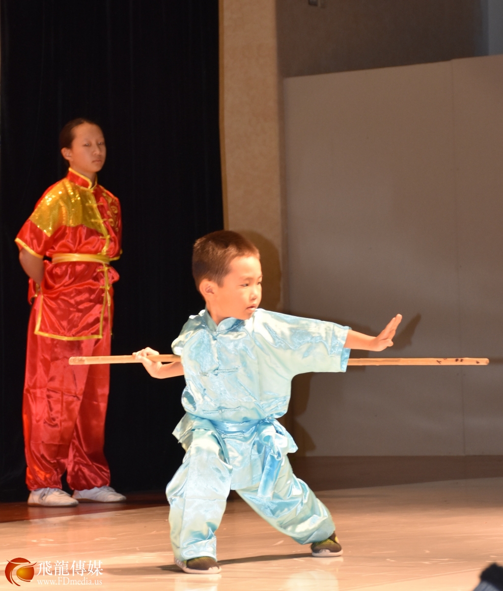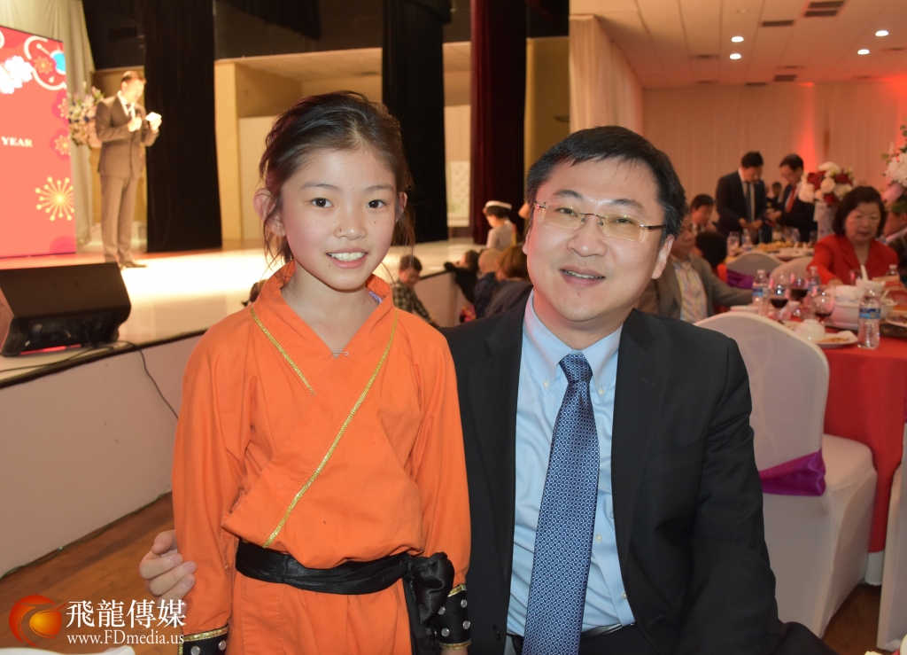 中国驻休斯敦总领馆新闻处刘波处长与释行浩少林武术学校的小明星王臻真合影。