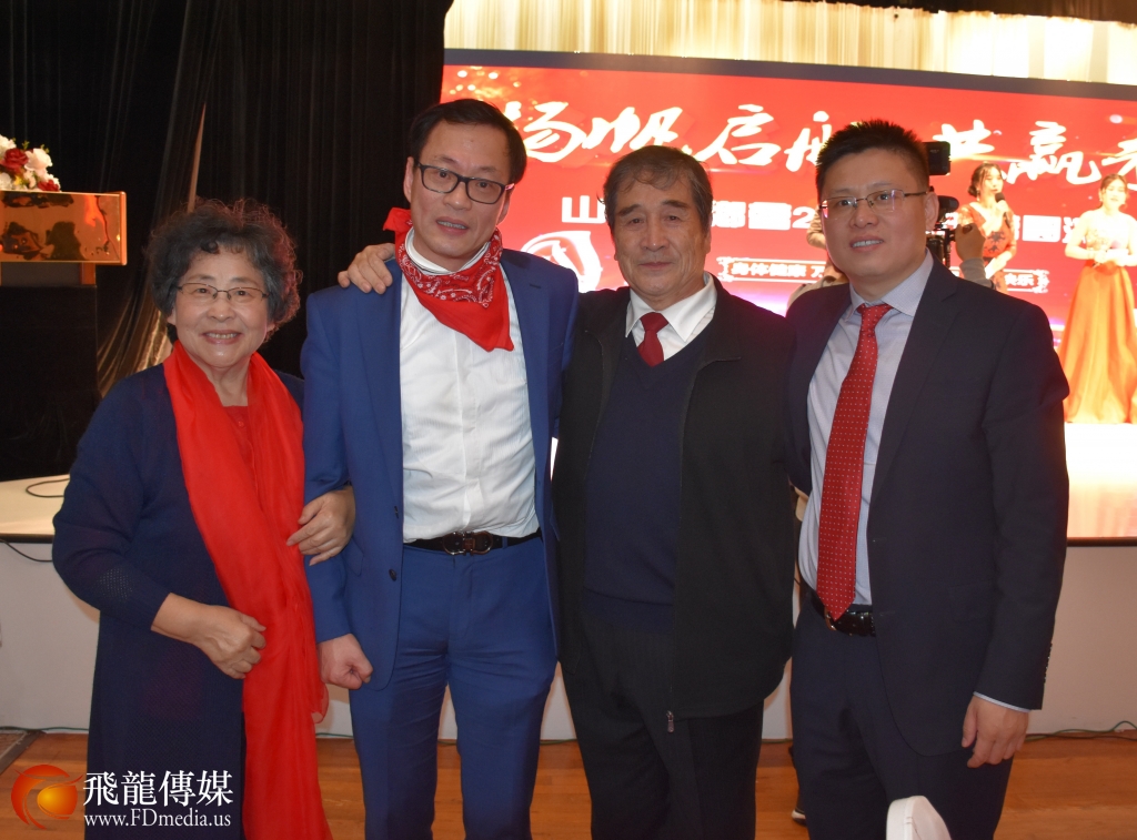 美南山东同乡会终生荣誉会长丰建伟(左二)、新任会长修宗明(右一)与杨复、赵启男合影。