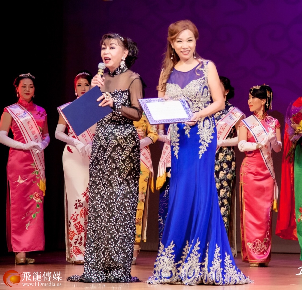 谭秋晴女士代表美国国会议员格林(AL Green)为HOT MAMA大赛创始人 陈铁梅女士颁发褒奖状。
