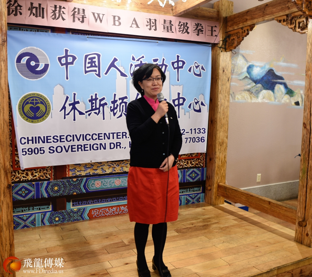 1月27日,休斯敦华侨华人为刚刚获得的WBA羽量级世界拳王徐灿庆功。中国驻休斯敦总领馆刘红梅副总领事亲自到场祝贺。休斯敦各华人社团负责人、中国人活动中心理事拉拉队60多人在北京烤鸭餐厅为徐灿庆功。