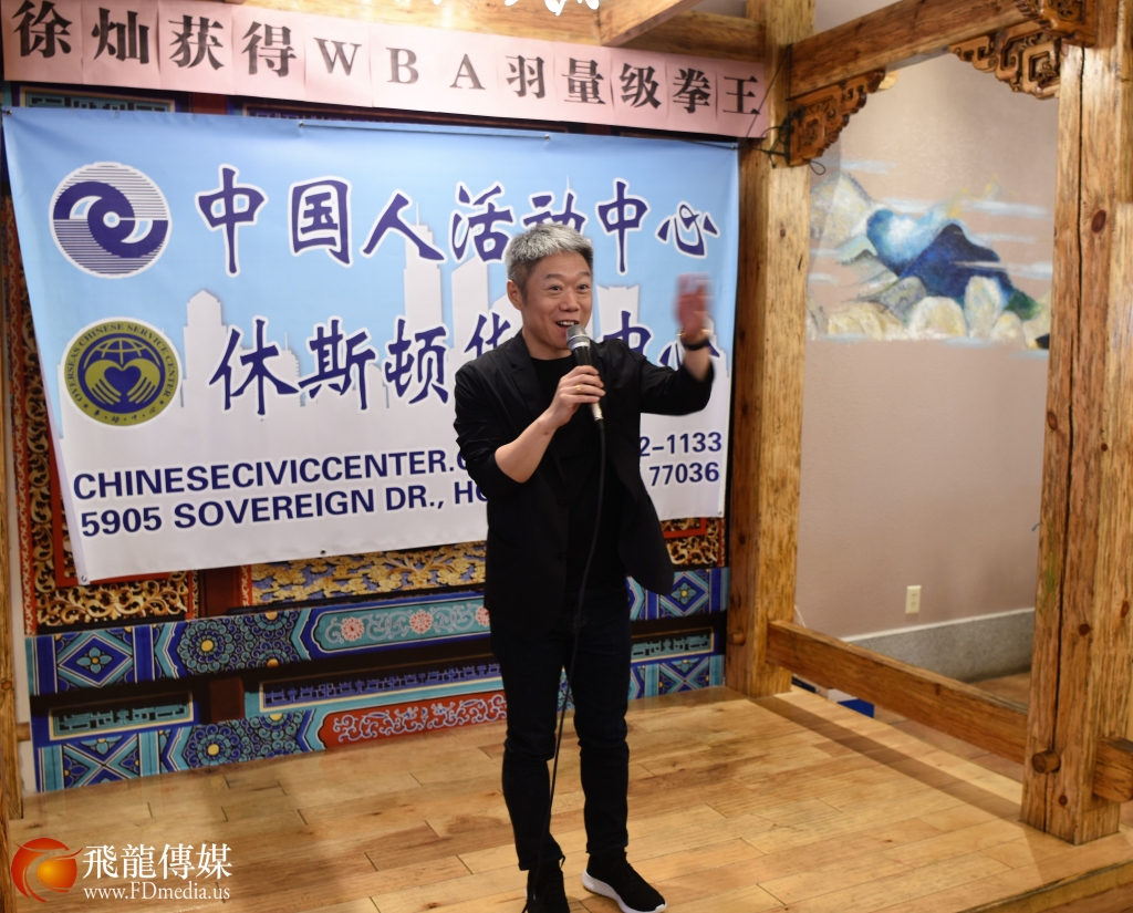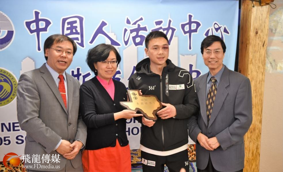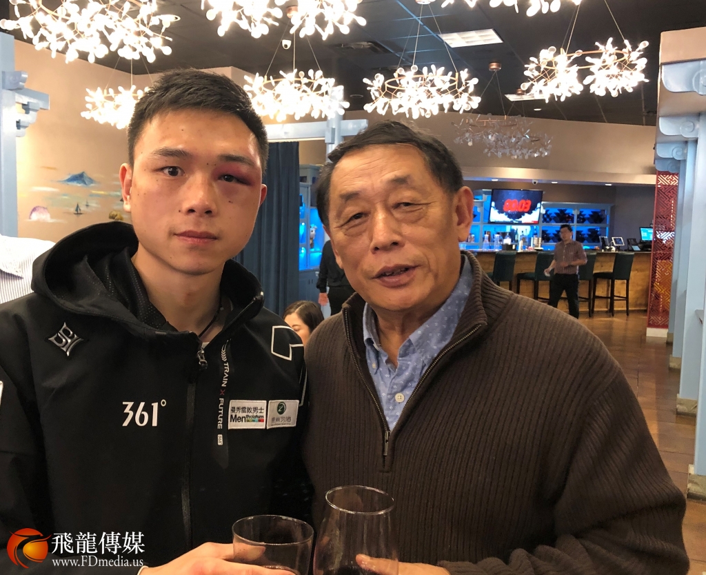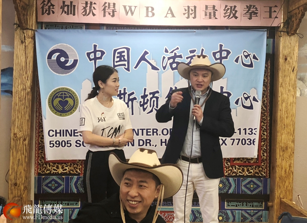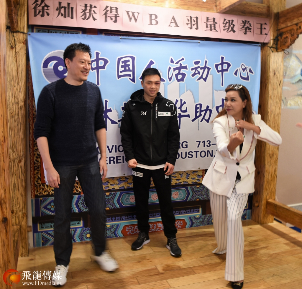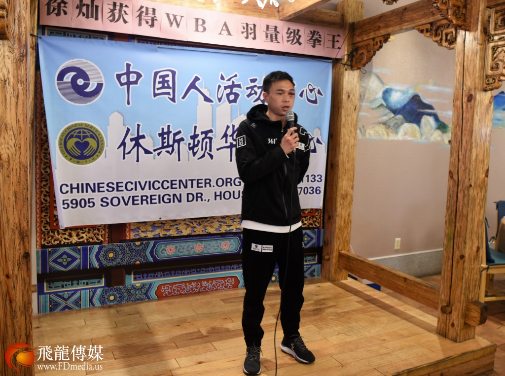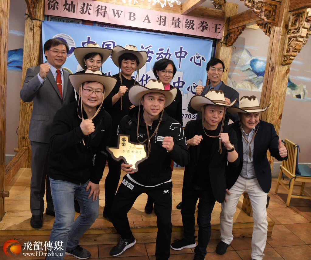 看到 徐灿右眼高高的肿起,脸部有些青紫,让在场的人心痛不已,他依然谦卑低调和所有人打招呼,陪着大家拍照留念,他的谦和得到休斯敦华侨华人的一致点赞。回想起昨天徐灿在胜利的一刻在接受记者采访时,记者问他,来休斯敦之前,没有知道你是谁,你的对手又很强,你是用什么力量赢他的?徐灿说;我的力量来自中国,我是中国人。
