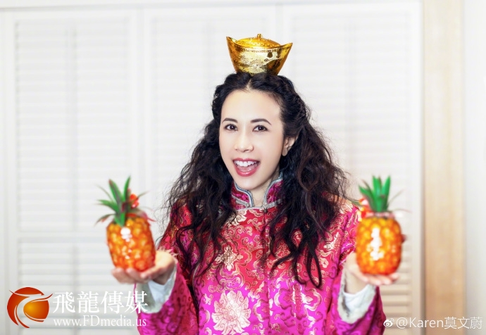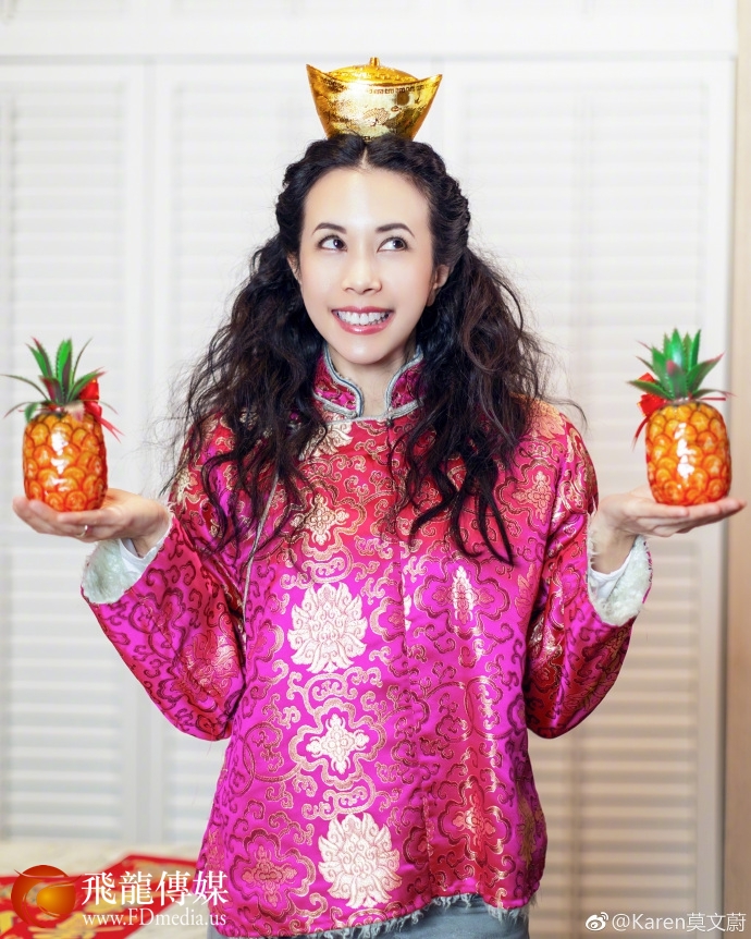 莫文蔚微博晒出一组顶元宝捧菠萝照,身着红袍用喷钱机上演“另类”拜年。