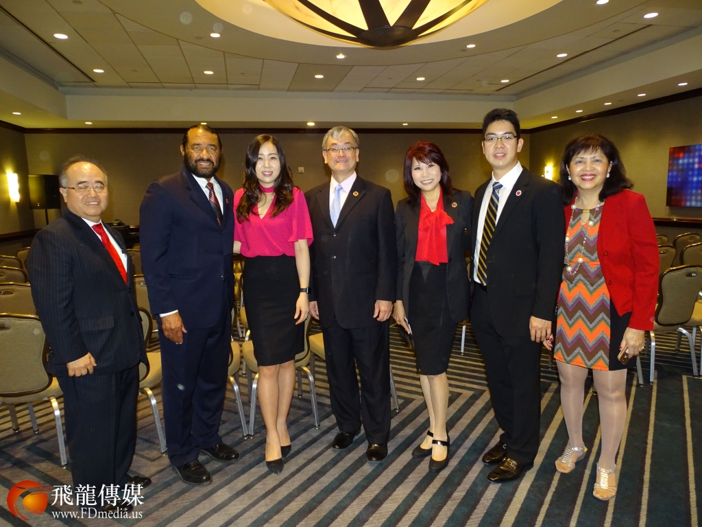 亚裔地产协会休斯顿分会创始人之一及荣誉主席 李雄(左一)、国会议员Al Green(左二)、全美亚裔地产协会(AREAA )执行总监 Hope Atuel(左三)、John Yen Wong (AREAA )休斯顿分会创始人之一、荣誉主席(右四)、全美亚裔地产协会休斯顿分会总裁 林富桂(右三)、休斯顿分会候任总裁 Eugene Wang。