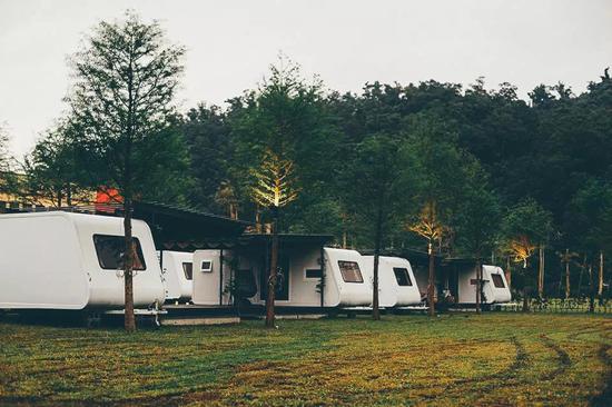 这是一个以露营车为主题的户外场所。一排排停放在绿地上的露营车,应该是不少人理想的退休后四处环游的选择。外观小巧可爱,内里却藏着温暖舒适的床铺、沙发和淋浴空间。