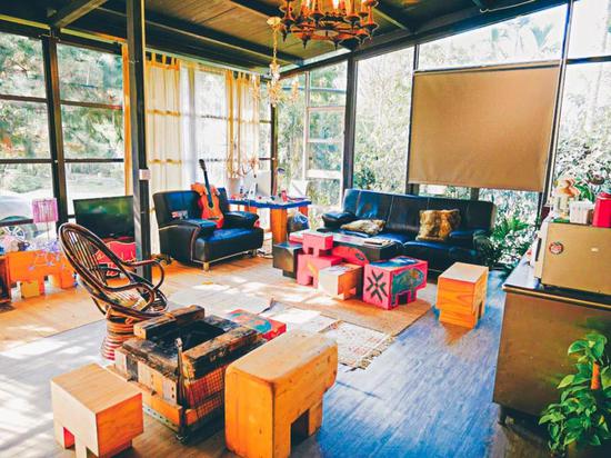 从高处望向露营区,飞鸟恰恰就像是山里的一处秘境,海拔 860 米的高度更适合夏日前来避暑。飞鸟恰恰提供了一部分区域给免装备露营的新手伙伴,最特别的是小木屋区,内部厨房、冰箱、餐桌、沙发客厅样样齐全,是一个营造出归家感的露营地。