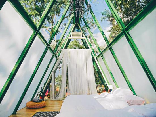 透着光的三角形建筑静静坐落在树林间,搭配纯白色的室内装置,让女孩们实现小时候关于住在玻璃房子里的梦。