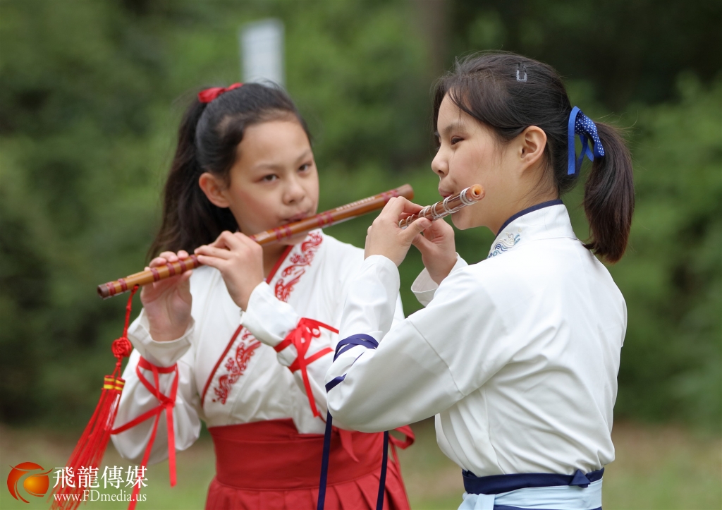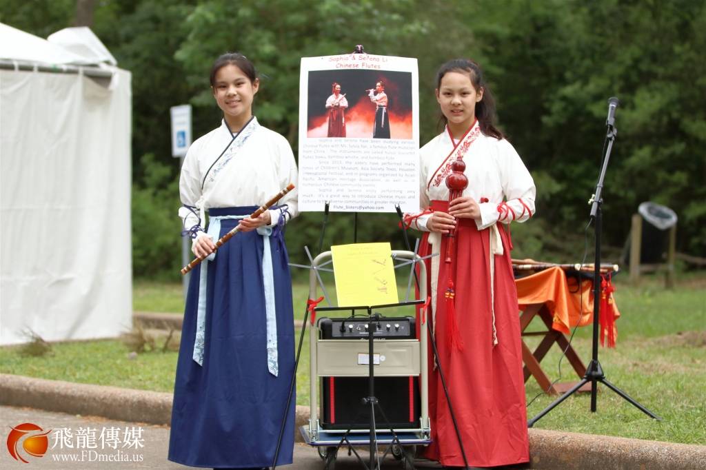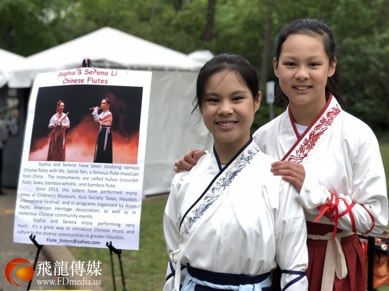 在艺术节入口处不远的一片空地上,只见两位身着汉服的华裔小姐妹面带微笑,落落大方,在寒风中用笛子、巴乌、葫芦丝等乐器演奏优美的民族乐曲。乐声悠扬动听,引来游客驻足观赏,博得阵阵掌声。其间,有的扶老携幼近前观看海报和乐器介绍,向小姐妹的妈妈细问二三;有的颇有兴致的用手机拍照录像,并热情的与演奏小姐妹合影留念。艺术节的摄影师多次为小姐妹的现场演奏拍照记录,给予充分的肯定和高度赞赏。小姐妹出众的音乐素养,和超凡脱俗的精湛表演,给艺术节带来别开生面的艺术情趣,也为大休斯顿各族裔游客展示了中华文化的魅力,自觉担当中华文化传播的使者,通过音乐这个国际语言,为人们了解中华文化提供一个窗口,可谓一枝独秀,奇葩共赏。