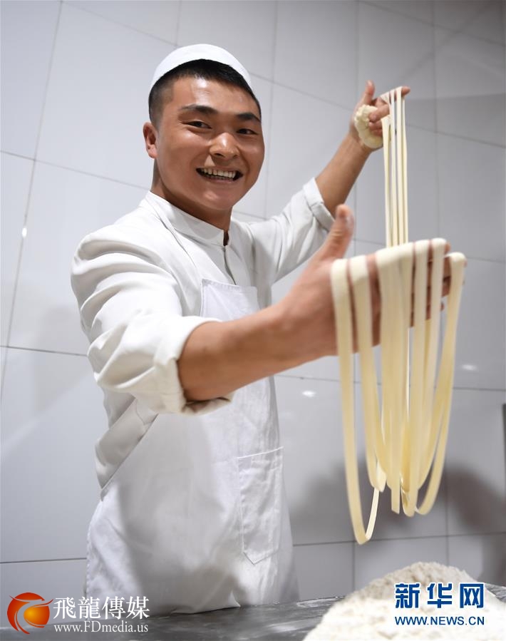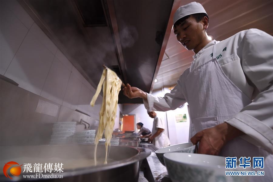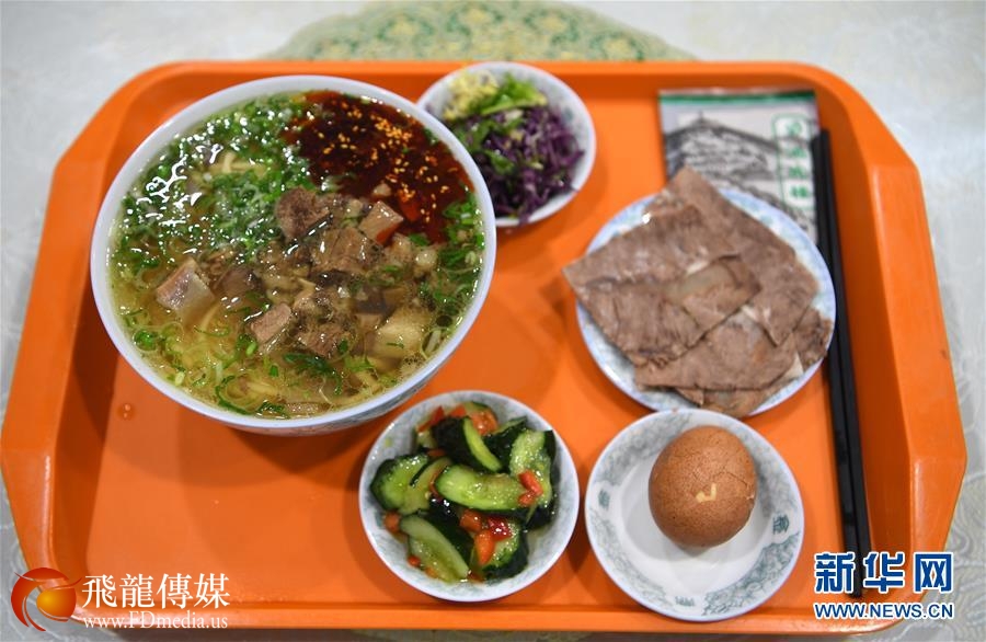 兰州牛肉面是“中式三大快餐”之一,拥有百年历史。它以“一清(汤清)、二白(萝卜片白)、三红(辣椒油红)、四绿(香菜、蒜苗绿)、五黄(面条黄亮)”的特色而蜚声中外。经过反复揉搓的面团在牛肉面师傅手中变化成粗细不一、圆扁不同的十余种面型。决定牛肉面味道的关键是浇在面条上的“老汤”,各个店家都有自己独特的汤料配方。从下锅煮面到端上餐桌,短短几分钟,一碗热腾腾的牛肉面便制作完成。冒着热气的汤面搭配各色辅料让食客唇齿留香,受到广泛欢迎。 新华社记者范培珅摄