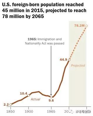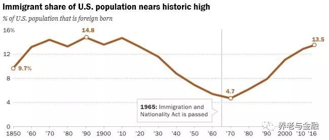 截止2016年,在外国出生的美国人口达到创纪录的4370万。自1965年美国移民法取代国家配额制度以来,美国移民人数翻了两番多。如今,移民占美国人口的13.5%,几乎是1970年的三倍(4.7%)。然而,如今的移民比例仍然低于1890年创纪录的14.8%,当时920万移民居住在美国。