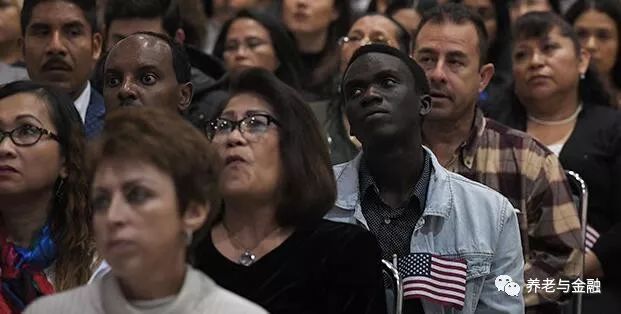 图:在洛杉矶的入籍仪式上,移民们一边听着演讲,一边等待成为美国公民。