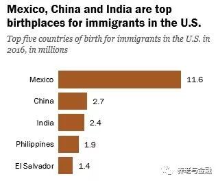 墨西哥是美国移民人口的主要来源国。截止2016年,美国有1160万移民来自墨西哥,占美国移民总数的26%。其次是中国(6%)、印度(6%)、菲律宾(4%)和萨尔瓦多(3%)。