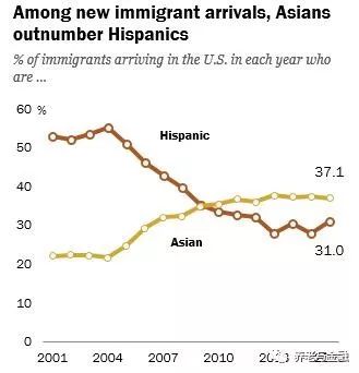 自2010年以来,按种族和民族划分,每年来美国的亚洲移民人数超过西班牙裔移民。在经济大衰退之后,拉丁美洲的移民放缓了,尤其是墨西哥,过去几年美国的移民出现净减少。