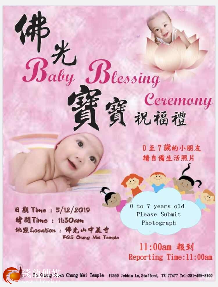浴佛节暨母亲节祈福法会 佛光宝宝祝福礼报名资格:0~7 岁 (颁发证书 ) 7~11 岁 (不颁发证书)