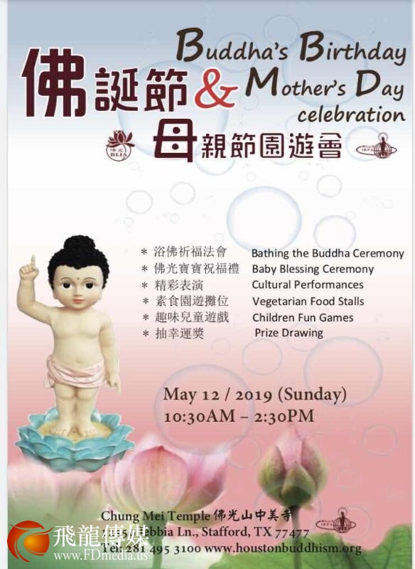 温馨的五月即将来临,为迎接一年一度的佛诞节暨母亲节。佛光山中美寺订于 5 月 12 日(週日)举办浴佛节暨母亲节祈福法会。2500 多年前的 4 月 8 日,印度迦毘罗卫国的王后摩耶夫人,在蓝毗尼花园无忧树下,生下悉达多太子,也就是后来出家成道的佛陀。