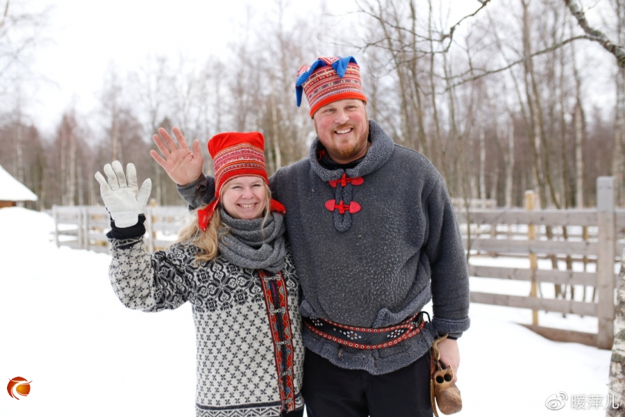 萨米人是拉普兰地区的土著居民,你在拉普兰会时时刻刻感受到萨米文化的浸润。Arkadia Reindeer Farm Arkadia,是拉普兰旅游名城凯米的一座驯鹿庄园。我们到的时候,男主人Samuli和女主人Paivi穿着萨米人的传统服装在庄园门口迎接我们。男主人穿着深蓝色上衣,高筒帽上带着蓝色的四只尖形角,腰间佩戴者着漂亮的芬兰刀,粗犷豪迈。旁边站着的女主人则戴着花边红色遮耳帽,圆圆的脸庞温柔可亲、笑意盈盈。