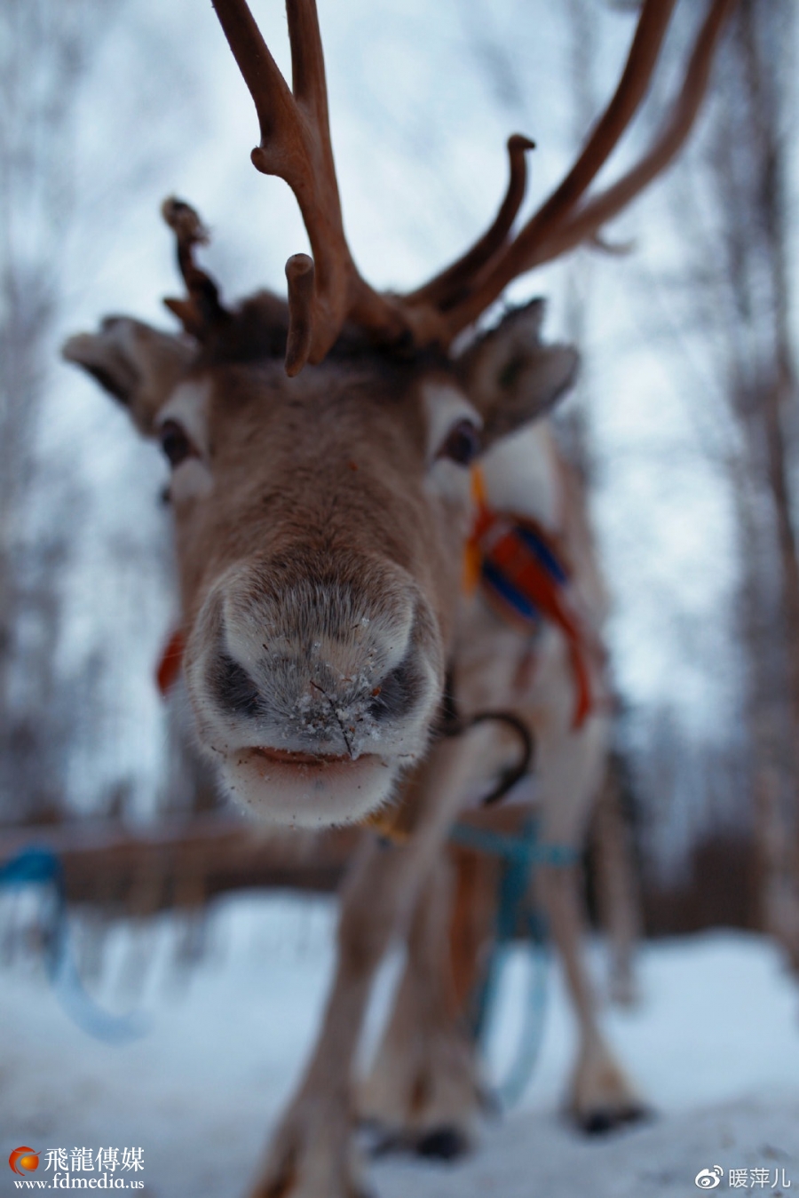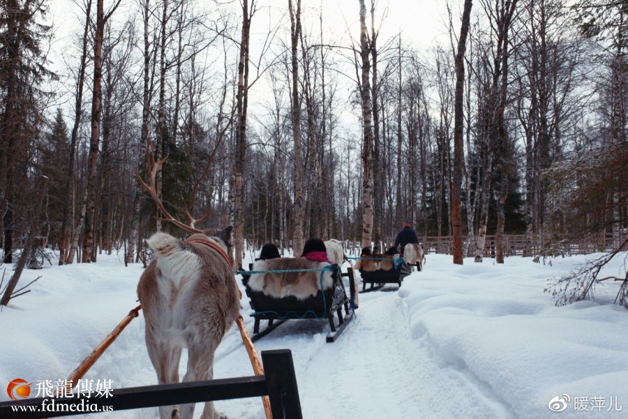 不过对我们来说,看到驯鹿已经足够心满意足!Paivi给了我们很多驯鹿最爱的“零食”,一种极地苔藓,这些小家伙们一点不怕人,争抢着来吃。喂食后,Samuli带我们乘坐驯鹿雪橇。驯鹿雪橇车队穿行在庄园后面的林海雪原中,伴随着阵阵清脆的鹿铃声,体验到了当年萨米人游牧生活的感觉。驯鹿过去是萨米人的主要交通工具,一头驯鹿拉雪橇要快过6只哈士奇一起拉的速度。不过,驯鹿这种动物生性顽固,很难驾驭,平均每10只才能训练出一只适合拉雪橇的驯鹿。