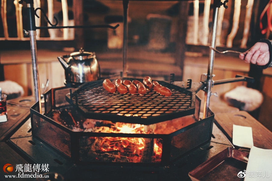 雪地撒欢后,我们进到了鹿苑旁边的拉普兰小屋,这可是男主人自己设计修盖的!可以容纳60人的小屋里陈列了一些传统的萨米工艺品,比如衣服、木杯、手套、鹿角、萨米鼓等等。屋子中间的炉子已经烧起篝火,焦香的香肠,热热的蓝莓汁,围坐在篝火边听Samuli和Paivi分享他们的庄园故事,一切显得静谧而令人难忘。