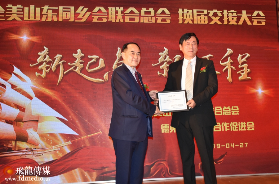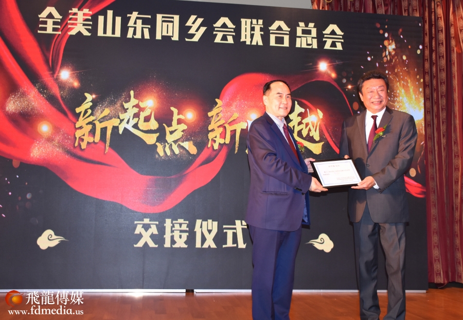 新当选的全美山东同乡会联合总会会长张磊给常务副会长田平春、荣誉会长刘风强、监事长徐庄颁发证书。