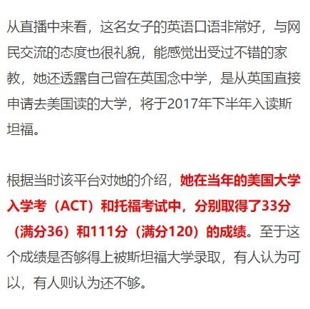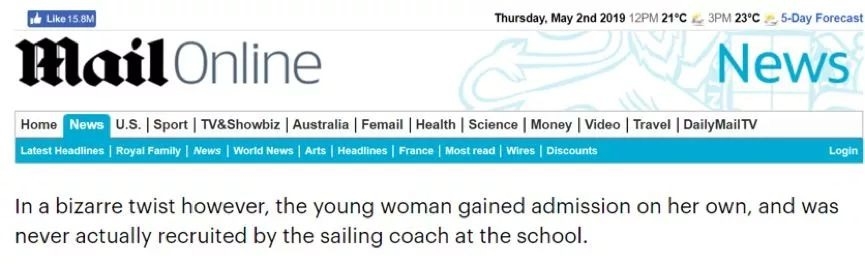 同样围观此事的英国《每日邮报》就在他们的报道中这样描述说:“但此案却出现了奇怪的转折,即赵涛的女儿并没有被斯坦福大学的帆船队录取,而是凭借自己被学校录取了“。