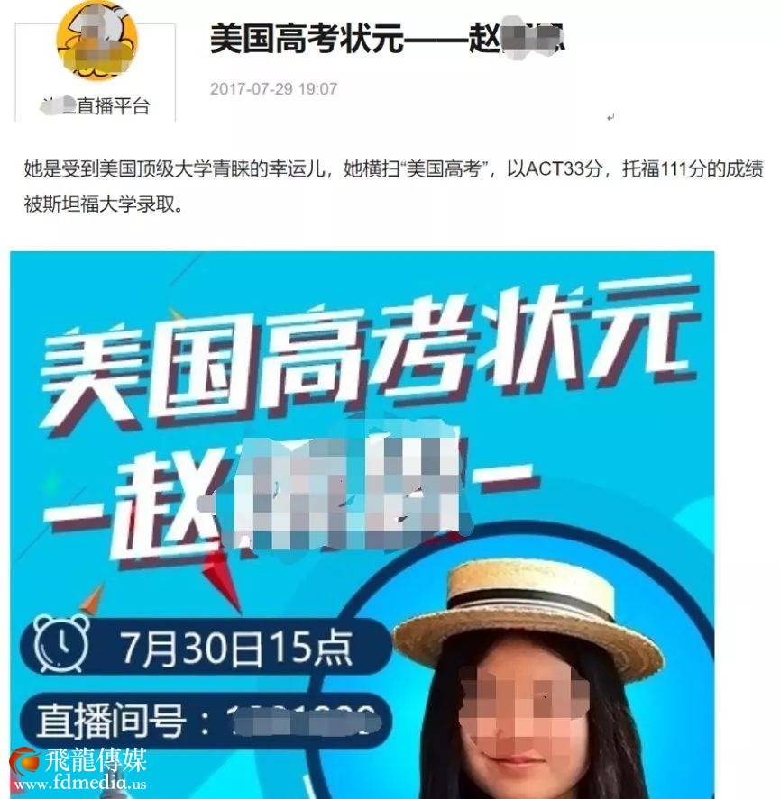 来自中国网络上的一些线索则显示,一个年龄、姓名、容貌以及被斯坦福大学录取的时间都与赵涛的女儿一致的女子,曾在当年被中国某视频直播平台作为“美国高考状元”进行过推广,还邀请这名“生活在一个大家庭”、“有着4个兄弟姐妹”的“普通女孩”分享了自己的考学经验。