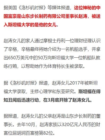 总之,事件中存在诸多疑点。恐怕这也是为何目前报道此案的众多美国媒体都保持了一定的克制,没有直接说赵家是通过行贿让女儿上的斯坦福,并强调说“目前尚不清楚赵涛和他女儿是否清楚辛格的违法行为”,以及“美国司法部门目前没有起诉赵涛和他的女儿”。