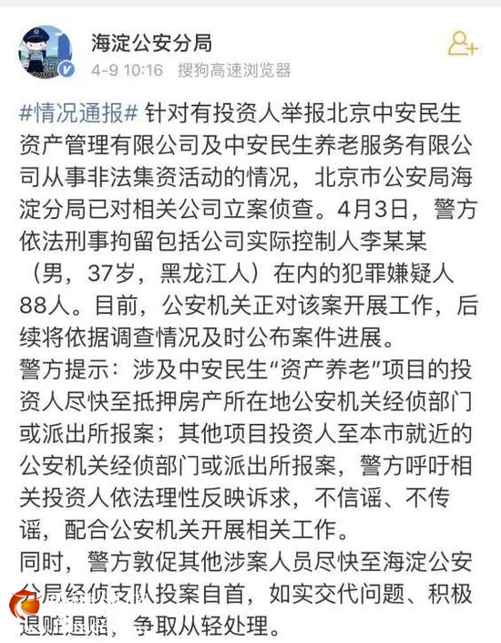 “2月底有一笔理财到期后,他们也没有返还本金,这时候就感觉出事了。”刘婷的预感很快被证明是准确的。4月9日,北京市公安局海淀分局官方微博通报称,针对有投资人举报北京中安民生资产管理有限公司及中安民生养老服务有限公司从事非法集资活动的情况,北京市公安局海淀分局已对相关公司立案侦查。