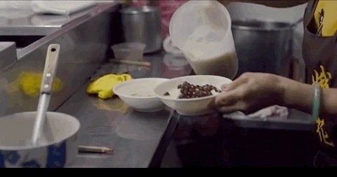 配料有珍珠、花生、绿豆、红豆、薏仁,店里老客还会加一根油条,浸到豆浆里,获得别样快乐。