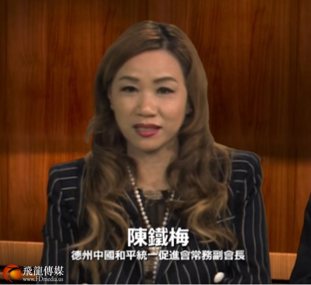 美国德州中国和平统一促进会常务副会长 陈铁梅在节目中说:海峡两岸同根同源,同胞血脉相连,同是炎黄子孙,和平统一是对中华民族及两岸人民最好的选择。而蔡英文上台以来,没有带领团队为台湾同胞提升福祉找方向,而是不停的做一些所谓的"文化台独、柔性台独及去中国化",蔡英文的这些动作造成台海关系紧张,台湾经济下滑,陆客减少,她本人的民调也在不停的下跌,事实证明蔡英文走的是一条不通的路,不得人心的路。最后陈铁梅代表德州和统会再次声明:坚持一中原则和九二共识,坚决反对台独。
