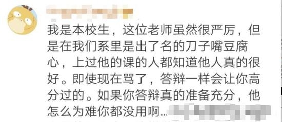 据知情学生反映,该老师其实是刀子嘴豆腐心,虽然要求严格,但只要学生答辩准备充分,并不会为难他们。