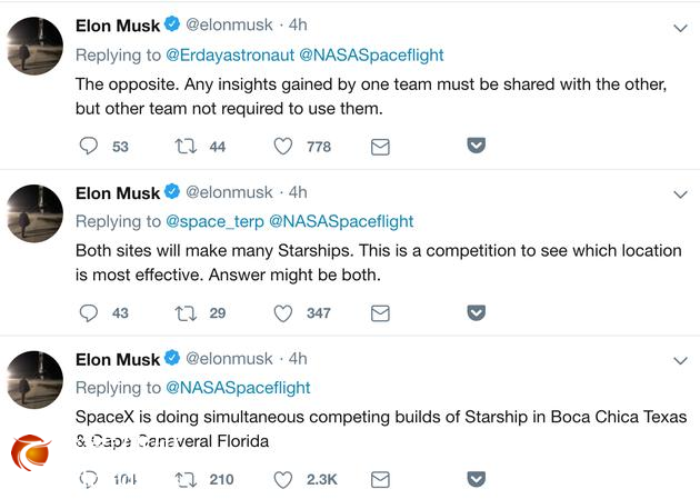“两地都会生产许多星际飞船,这是一场竞赛,看看哪一处能够更有效率。答案可能是都不错。”马斯克说,“任何一边所获得的观察洞见,将会被分享给另外一边,但这一边的团队可以并不使用这些观察结论。”