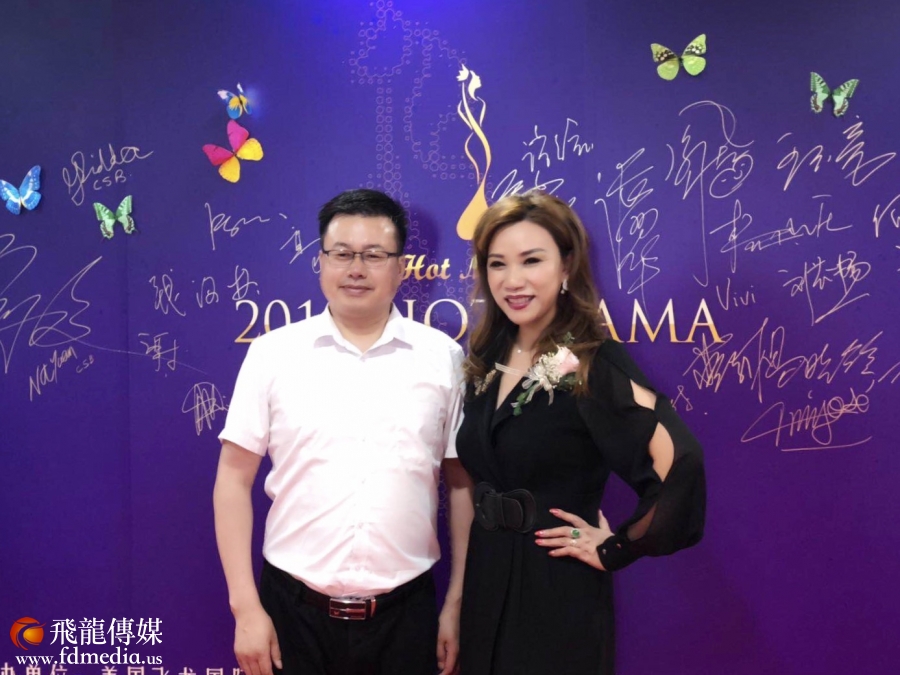 2019 HOT MAMA全球大赛合作伙伴《华人卫视》董事长高超与陈铁梅合影留念。