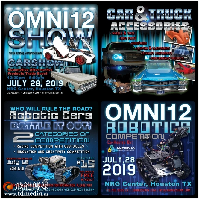 喜欢车子的朋友注意: 7月28日12pm-6pm在NRG Center举办Omni12 Show车展, 届时会有各种改装车参展。本次车展同时也包含了一个机器人车赛,由Ameriduo 协办。参赛注册免费。12岁以下儿童免费。通过21usBuy购票享受额外10%off, 进场门票12岁及以上仅需$13.5加税(原价$15)。点击购票:https://www.21usbuy.com/index.php?_route_=Ticket/Houston/20190606