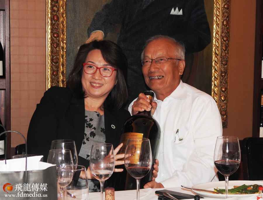 吴文龙董事长把特大红酒瓶送给公共事务部经理周明洁作纪念。