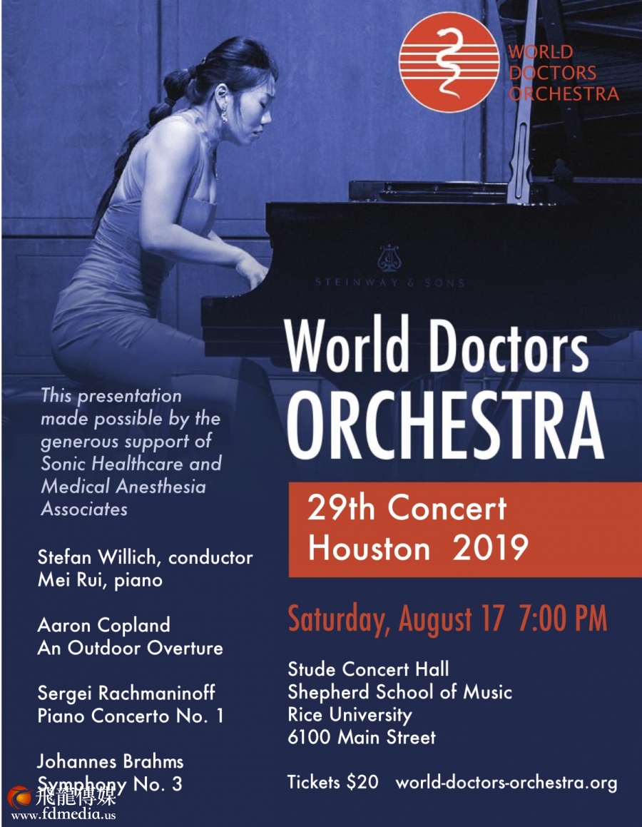 信息由主办方提供: 世界医师管弦乐团即将于8月中旬莅临休斯顿首演并安排一星期的活动,以圆满乐团有史以来第29场次的演出。这支音乐队伍的成员,是分散在全球各地的精英: 他们既是专业医师,也是学有所成的音乐家。