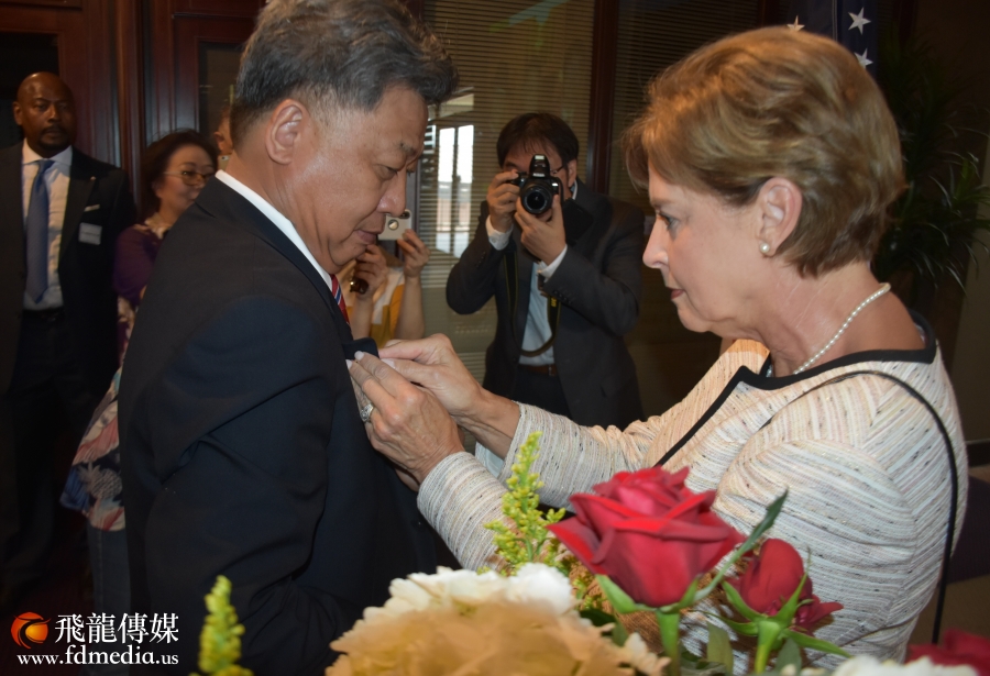 飞虎队陈纳德将军的孙女嘉兰惠给李强民总领事带上象征两国友谊的徽章。