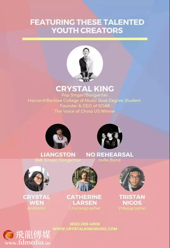 由Crystal发起,一群年轻的追梦人在进入大学前举行名为Youth Creators’ Night的慈善音乐会。他们都是高中生,在音乐与表演方面拥有特殊的天赋,很小的时候就在各类大赛中获得很多嘉奖。他们在开学前联合为大家呈献一台别开生面的演出,这场演出所得全部捐给由Crystal Wang 发起的SOAR慈善组织。据了解本次演出形式多样,包括唱歌,舞蹈,视频,动画,乐队等等,希望社会各界多多支持,给予年轻人一些鼓励。