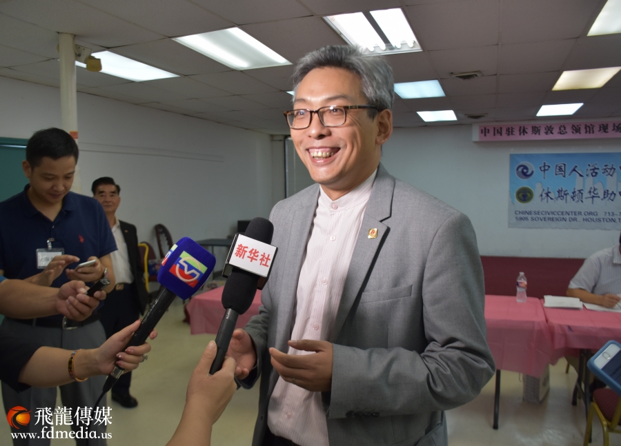 蔡伟总领事接受采访。他说;休斯敦总领馆管辖区域包括美国南部得克萨斯、俄克拉荷马、阿肯色、路易斯安那、密西西比、亚拉巴马、佐治亚、佛罗里达八个州和波多黎各 ,有很多华侨生活居住在这里,总领馆将会一如既往的为侨胞做好服务。