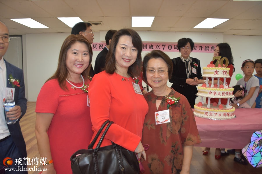 右起:休斯敦华星艺术团团长鲍玲、恒丰银行公共事务部经理周明洁、公关刘妍庆祝国庆。