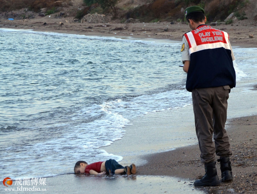 图二:2015年9月2日,一个武警士兵在土耳其南部博德鲁姆海岸边进行现场调查,一个名叫库尔迪的3岁男童躺在那里,脸上早已毫无生气。库尔迪的家人从叙利亚逃出来,坐上了一叶充气式小艇,朝着希腊的科斯岛驶去。不幸的是清晨时分船翻了,他与母亲和哥哥均溺水。