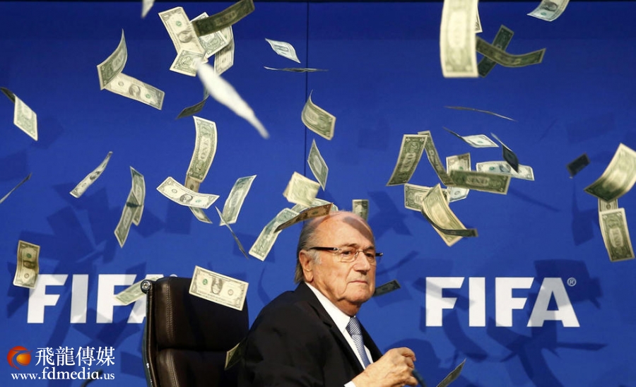 图五:2015年7月20日,FIFA总部瑞士苏黎世,英国喜剧演员Lee Nelson在国际足联执委会后的新闻发布会上把钞票撒向FIFA主席Sepp Blatter。FIFA将会在来年2月26日投票选出一个新的主席来取代他。