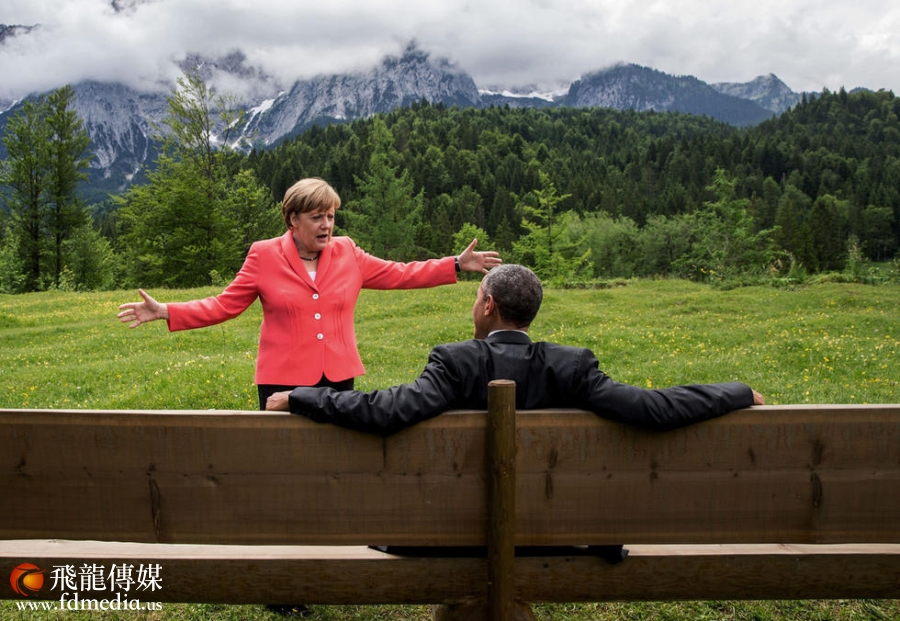 图四:2015年6月8日,德国总理默克尔与美国总统奥巴马G7会议期间在德国加尔米施-帕滕基兴地区附近的顶级度假酒店Schloss Elmau的长椅上谈话。