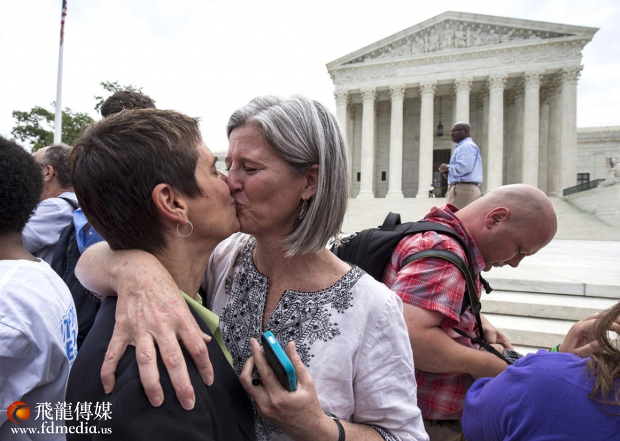图六: 2015年6月26日,美国宪法通过同性婚姻的提案,一对同性恋人在华盛顿最高法院门外拥吻。