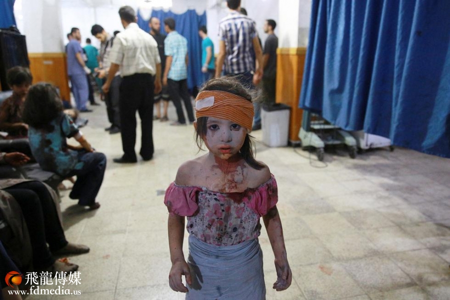 图八:2015年8月22日,叙利亚首都大马士革的东面,一个受伤的叙利亚女孩站在杜马的反叛军控制下的临时医院里,身上满是炮击和空袭留下的痕迹。至少20个平民死亡,另有200个受伤或被困在杜马。六日后,空袭又夺走了100人的生命,国际社会强烈谴责在叙利亚长期战争中,这次政府袭击最为血腥。