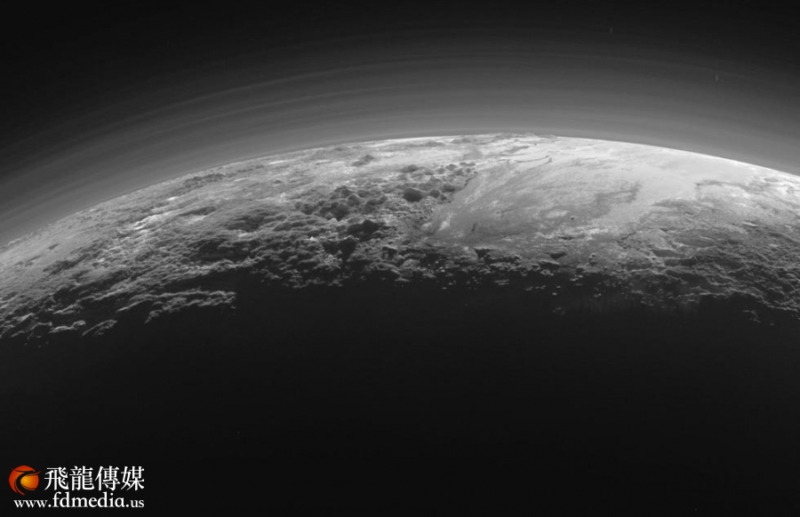 图九:2015年7月14日,在地球到达距冥王星最近的点后的15分钟,美国宇航局NASA拍下了这张日落前冥王星表面的崎岖的冰川和平坦的冰原,逆光突出了冥王星稀薄但膨胀的大气层,拍摄点大概距离地球17702千米。