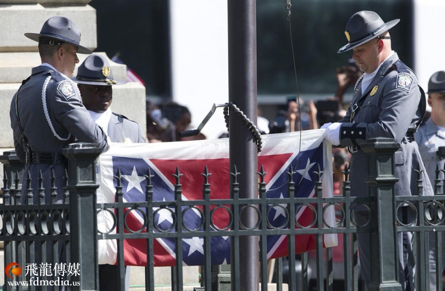 图十:2015年7月10日,南卡罗来纳州公路巡警正在州议会大厦降下南部联邦战旗,结束了其54年的悬挂。这面旗子的存在已经争议了数十年,最终因为6月17日针对非裔卫理公会新教教堂的惨案事件退出历史舞台。