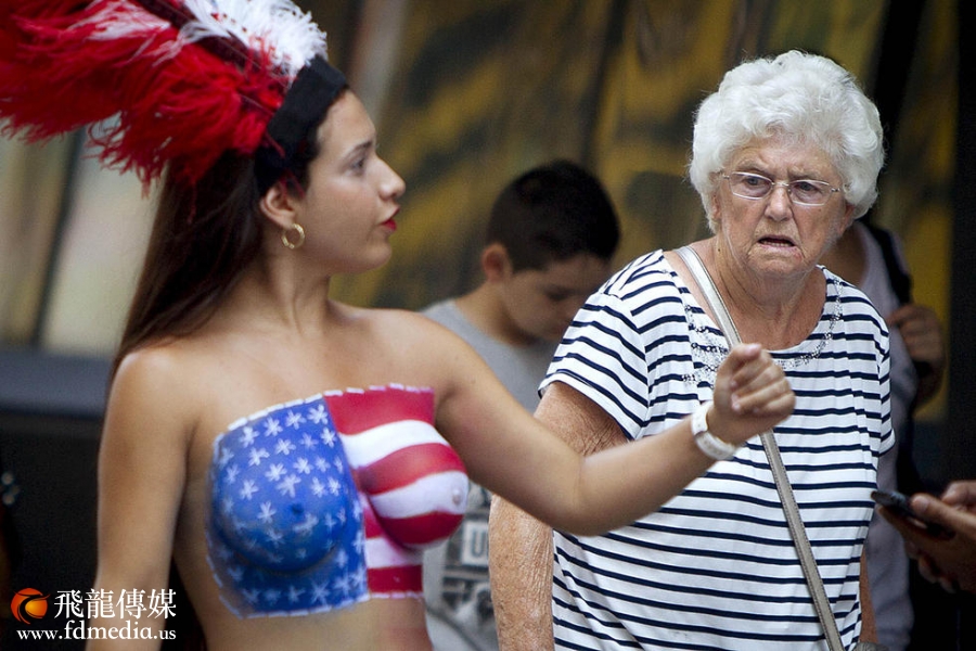图十一:2015年8月18日,在时代广场,一位涂着身体彩绘,只穿内裤的女性裸身走在街上为收小费摆着造型,当地媒体称纽约市官员,包括比尔市长都在思索对策减少相关活动。