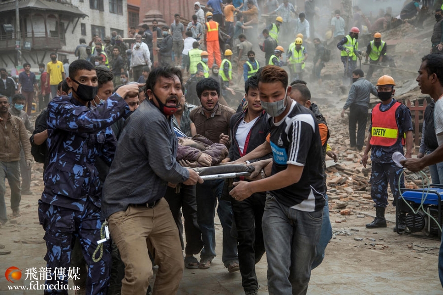 图十二:2015年4月25日尼泊尔加德满都地震后比姆森塔坍塌,救援人员正在抬着一位受害者狂奔。9000人先后死于4月和5月的两次大地震。最高震级达到了7.8级。地震甚至引起了喜马拉雅山脉的雪崩。